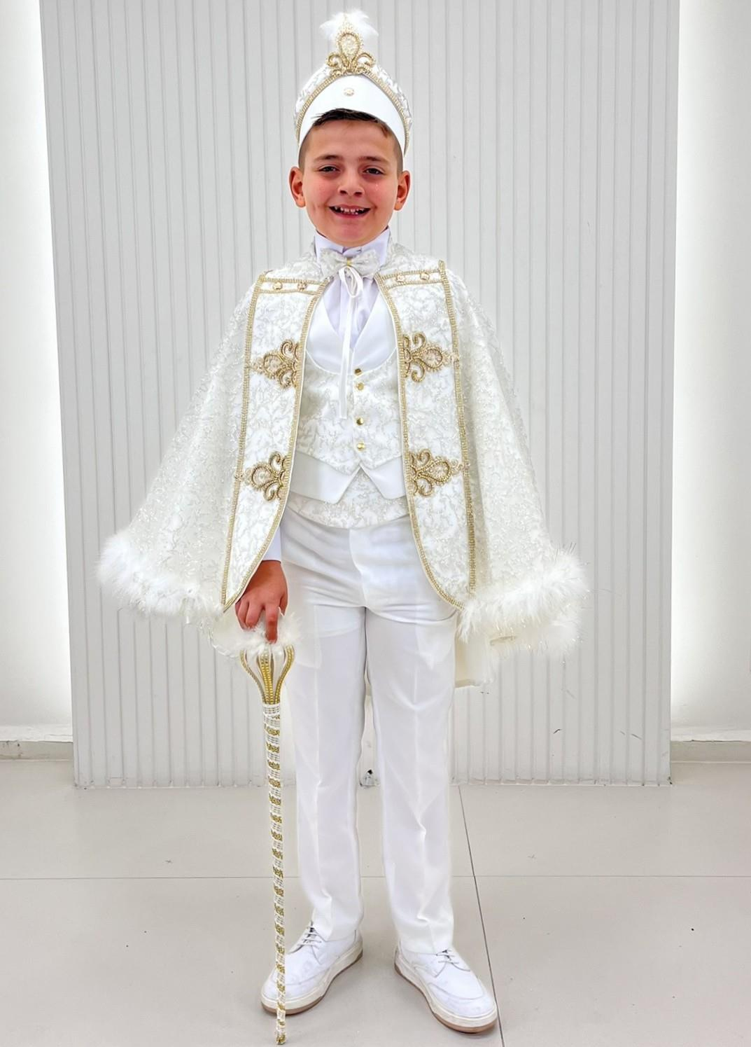 Krem Desenli Simli Kumaşa Gold Rengi Nakışlı Şık Pelerinli Sünnetlik